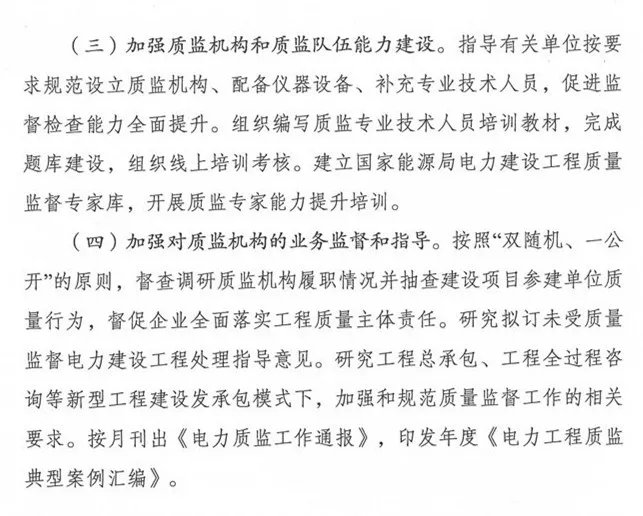 通知要求,2019年要积极构建电力建设工程质量监督体系,完善电力建设工程质量监督技术支撑体系,配合电力安全监管司制定水电、核电常规岛、海上风电、光热发电、生物质发电、GIL综合管廊工程、海底电力电缆输电工程、调相机工程、柔性直流输电工程等质量监督检查大纲。研究修订火电、光伏发电、风电、输变电工程质监大纲。开展储能电站等新型电力建设工程质量监督研究。