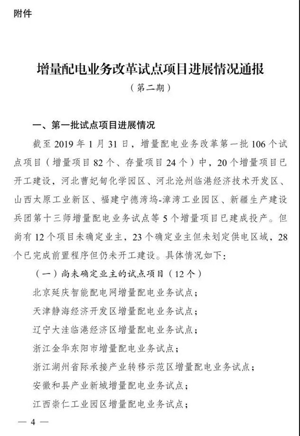 4月3日,国家发展改革委办公厅、国家能源局综合司联合发布《关于印发<增量配电业务改革试点项目进展情况通报(第二期)>的通知》(发改办体改〔2019〕375号,以下简称“通知”)。《通知》指出,2016年11月以来,国家发展改革委、国家能源局分三批在全国范围内开展了320个增量配电业务改革试点,但一些地区试点工作推进不力,试点项目迟迟难以开工建设。为加快推进增量配电业务改革试点,国家发改委、能源局于2019年1月印发《关于进一步推进增量配电业务改革的通知》(发改经体〔2019〕27号),对试点项目中出现的主要问题明确了政策要求,细化了相关措施,但部分地区落实情况较差,试点项目进展依然缓慢。