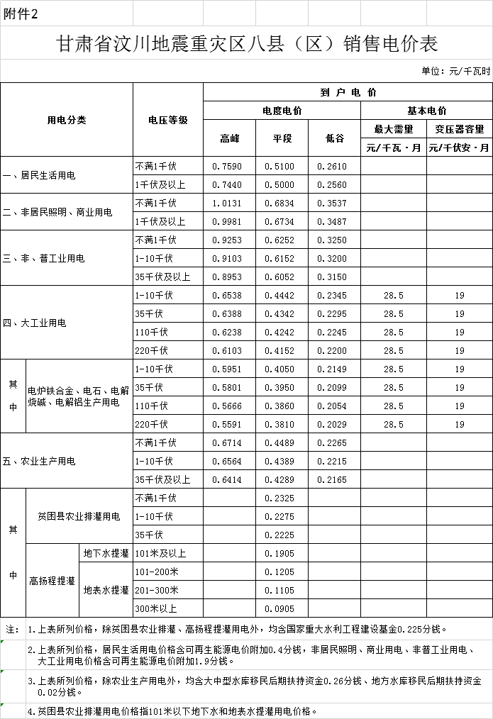 2.甘肃省汶川地震重灾区八县(区)销售电价表